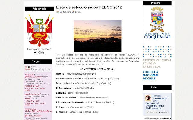 Me alegra mucho contarles que el corte de 2hs de HORSES fue seleccionado en el Festival Internacional de Cine Documental de Coquimbo FEDOC 2012 y compite en el rubro Mejor pelicula internacional.